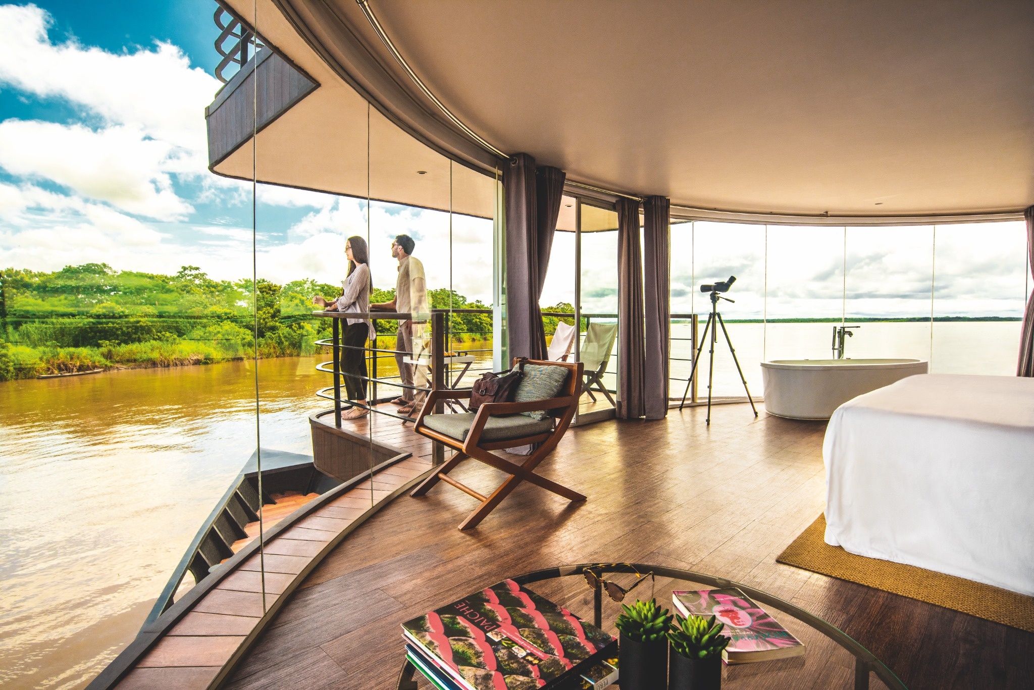 The Zafiro Experience offers refined Amazon cruising for travelers who seek luxury with meaning.This 19-suite vessel blends contemporary comfort, curated design, and warm hospitality with immersive nature and cultural experiences. Guests enjoy panoramic suites with private balconies, Slow Food-inspired cuisine, and a deep commitment to sustainability and community partnerships.
